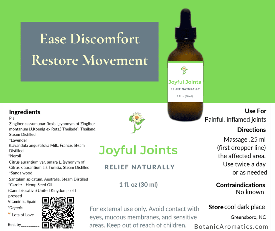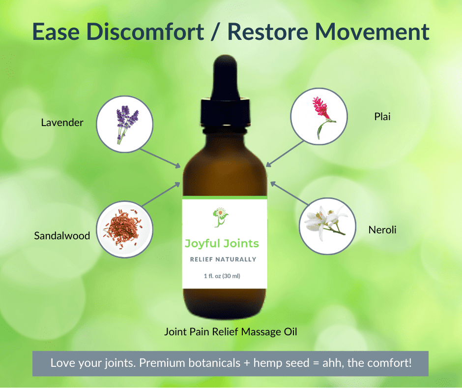 Joyful Joints is a natural pain relief topical oil blend made with Plai (Zingiber cassumunar), neroli, sandalwood, lavender, hemp seed oil, and vitamin E. Designed to relieve joint pain, reduce inflammation, and support mobility—all in a 30 ml bottle for targeted massage and daily care.