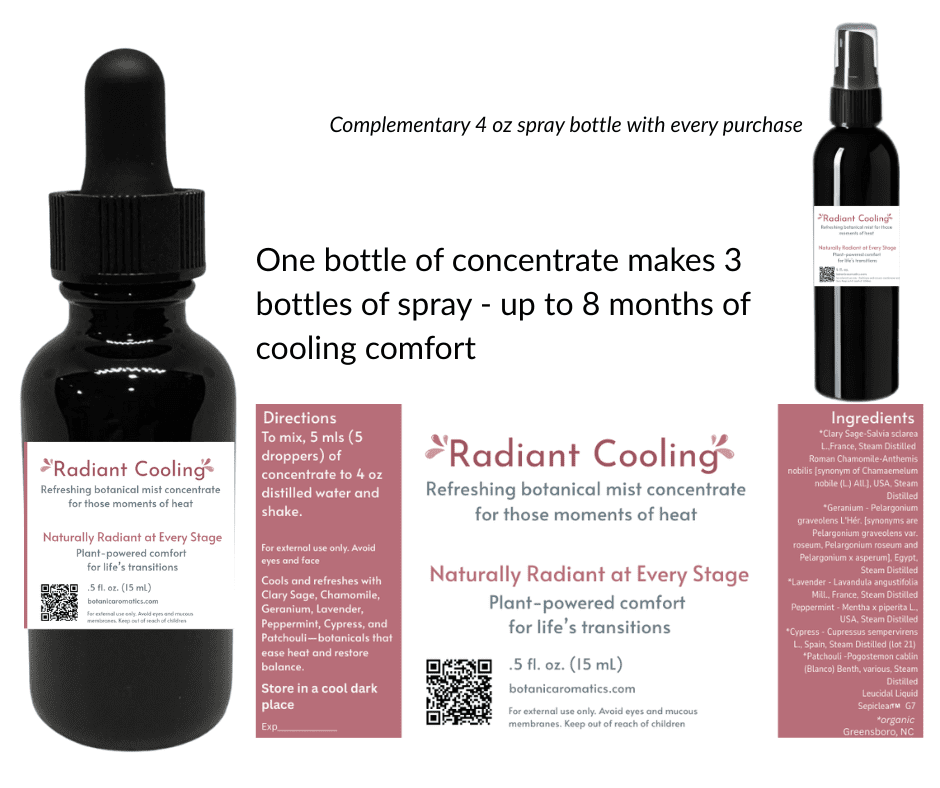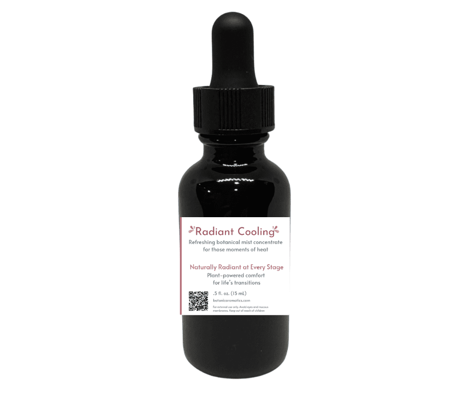Radiant Cooling is a refreshing, plant-based support spray designed to help ease the discomfort of hot flashes and provide calm during the shifting rhythms of menopause. This gentle, concentrated blend is created with GCMS-tested essential oils and botanical ingredients to bring natural relief with every spritz.