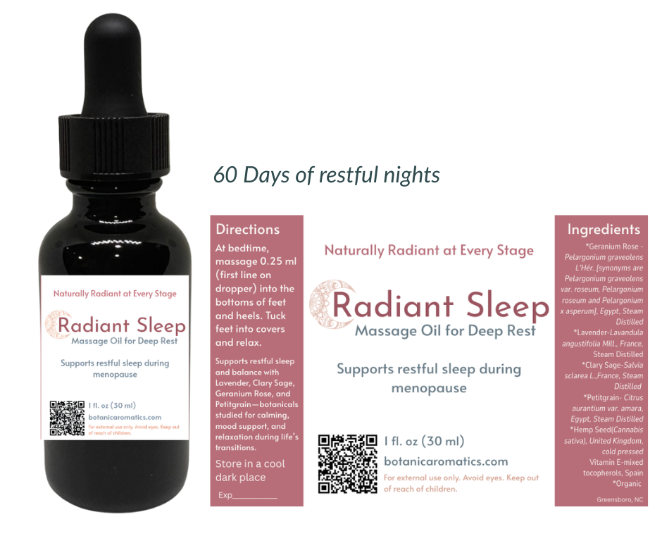 Blended with Geranium Rose, Lavender, Clary Sage, and Petitgrain — botanicals studied for their calming and mood-balancing effects — Radiant Sleep helps quiet the mind and restore comfort during nighttime transitions. Carried in nourishing hemp seed oil with a touch of vitamin E, this massage oil is designed for nightly use. Massage onto the bottoms of the feet before bed, tuck into the covers, and let nature’s botanicals guide you toward restful, radiant sleep.
